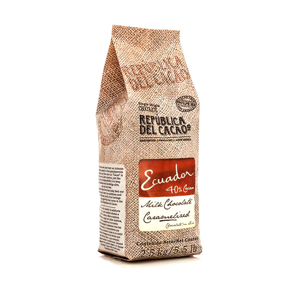Savor the decadence of Republica del Cacao Ecuador 40% Single Origin Caramelized Milk Chocolate Buttons, meticulously crafted by the Chiriboga brothers for Chocosphere. Dark in color and sourced from Ecuador's Andes and coastal plains, this chocolate boasts warm and complex caramel notes, harmonizing with pure Nacional Arriba flavors. Using a revived ancient process, the milk is slowly and naturally caramelized, culminating in a sublime blend of honey, roasted nuts, and warm biscuits. With no added flavoring, these buttons embody pure, natural, and authentic goodness, and are ideal for mousses and ganaches. Available in a factory 2.5 kg bag or a recloseable 1 kg bag, repacked by Chocosphere, bring the essence of Ecuador to your chocolate creations.