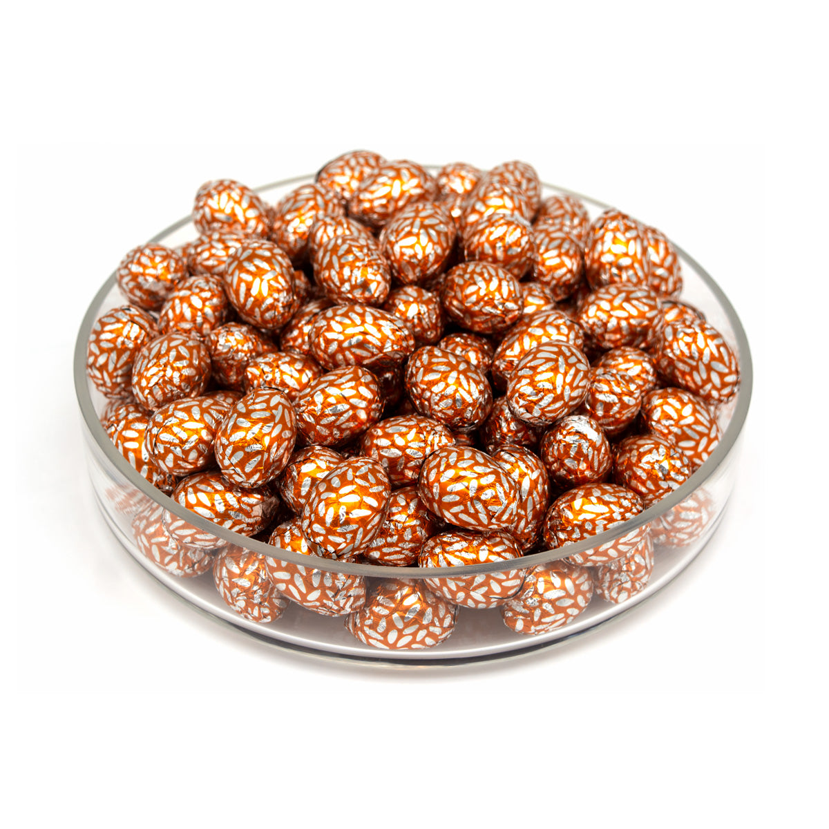 Valrhona Dark Chocolate with Caramelized Apricot Wrapped Eggs combine the finest French chocolate craftsmanship with a unique flavor pairing. Each patterned foil-wrapped egg features a rich dark chocolate shell that gives way to a smooth milk chocolate ganache infused with luscious caramelized apricot purée. The deep cocoa notes contrast beautifully with the fruity sweetness, creating a sophisticated taste experience. Crafted in the Rhône Valley, these chocolates reflect Valrhona’s dedication to quality and sustainability. Available in a factory 2 kg box, a 1 kg bag repacked by Chocosphere, or a 33-piece bag. Supplies are limited.