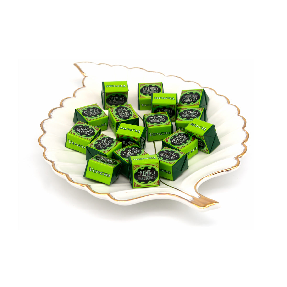 Venchi Cremino Pistacchio Dark Chocolate Pistachio Cubes offer a luxurious three-layered indulgence, combining rich, velvety dark chocolate with the distinctive flavor of pistachio. The top and bottom layers feature smooth dark chocolate blended with pistachio paste, creating an intense, nutty richness, while the center layer of salted pistachio cream adds a subtle savory contrast. Each 11-gram cube delivers a harmonious balance of sweet, salty, and deep cocoa notes, reflecting Venchi’s 145-year Italian chocolate-making tradition. Available individually or in bags of 17 or 1 kg, these pistachio Cremino cubes are perfect for gifting or savoring one exquisite bite at a time.